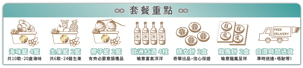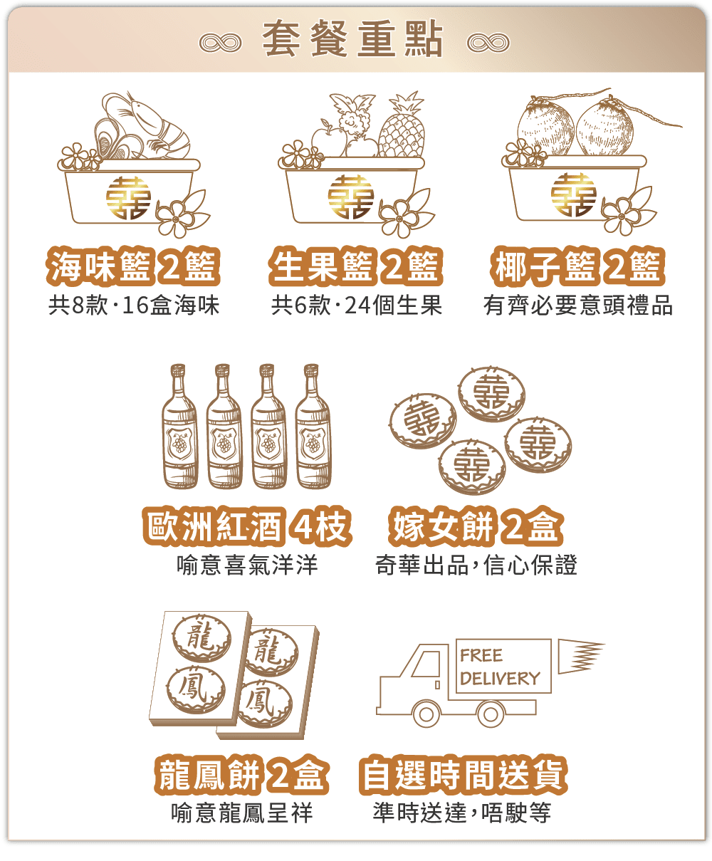 【金石同心 6籃過大禮套裝 】8式過大禮海味禮籃+6式過大禮生果禮籃+過大禮金椰子禮籃 贈送唐餅+龍鳳餅+紅酒+送貨