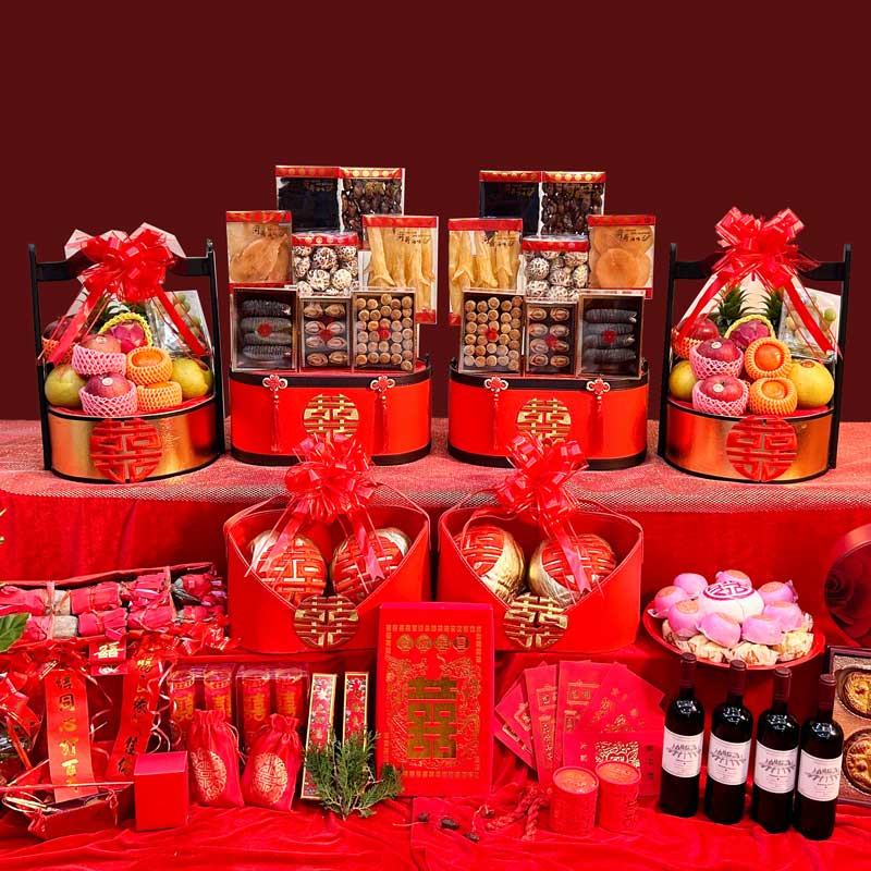 【佳偶天成 6籃尊尚過大禮套裝 】8式過大禮海味禮籃 + 6式過大禮生果禮籃 + 過大禮金椰子禮籃 + 女家回茶禮 + 唐餅 + 龍鳳餅